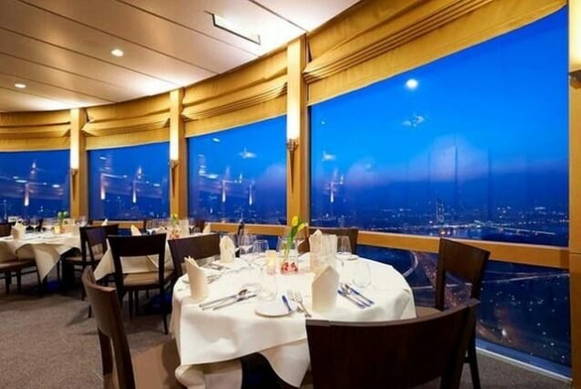 في قمة البرج، ممكن تستمتع بكافيه أو وجبة خفيفة في المطعم الدوّار اللي بيلف 360 درجة، عشان تشوف القاهرة كلها في مشهد واحد لا يتكرر 🌇